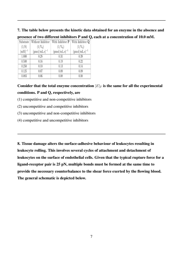 The table below presents the kinetic data obtained for an enzyme in the absence and presence of two different inhibitors P and Q, each at a concentration of 10.0 mM.
