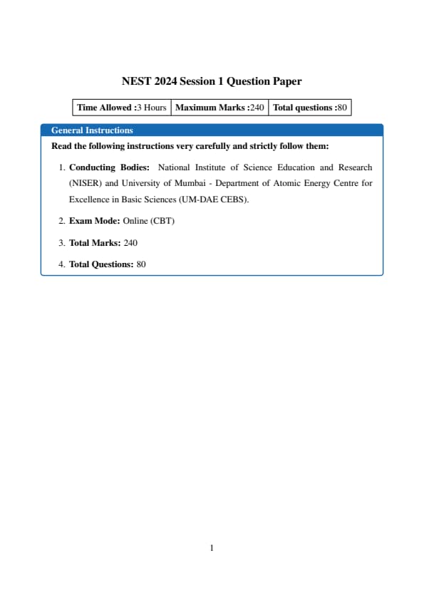 NEST 2024 Question Paper with Answer Key PDFs Session 1