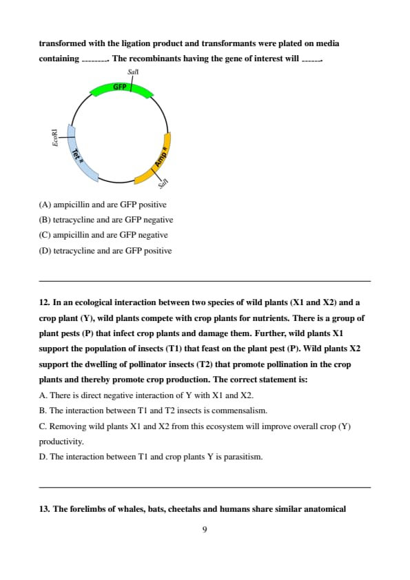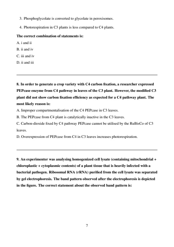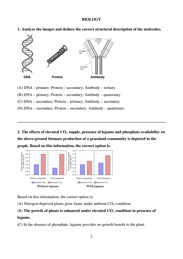 (D) is incorrect because with phosphate and legume, biomass is still higher under elevated CO\(_2\). Quick Tip: When analyzing plant growth experiments, always compare the relative bar heights to infer treatment effects. Elevated CO\(_2\) generally increases biomass, but synergistic effects (e.g., with legumes or nutrients) can amplify this response.