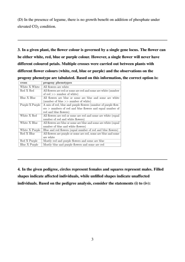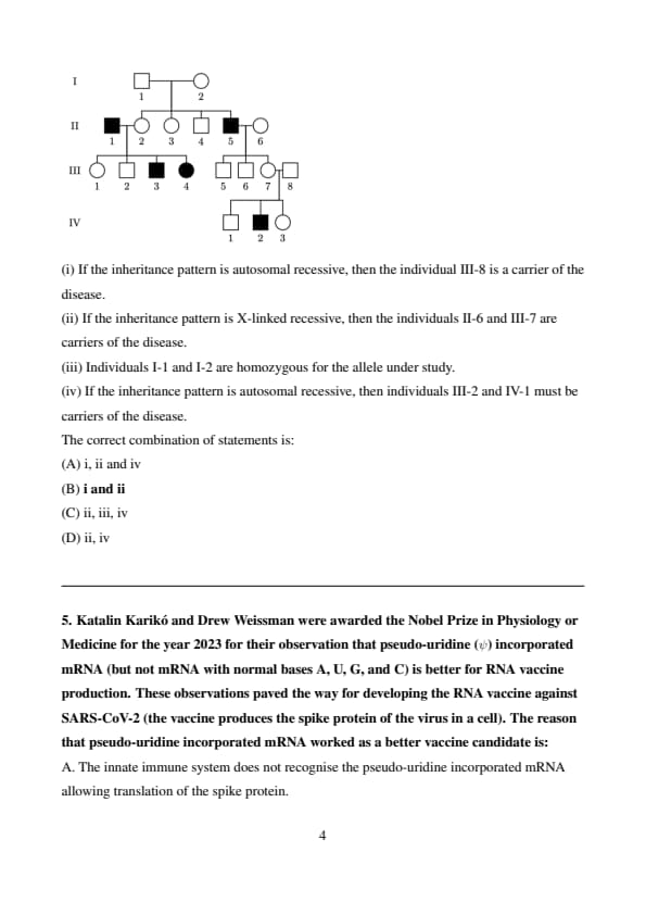 So statement (iv) is partially incorrect. Quick Tip: In pedigree analysis, use parent-offspring relationships and affected status to deduce inheritance patterns. Carriers are usually inferred when an unaffected individual has an affected child (for recessive traits).