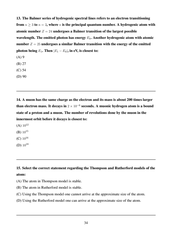 Substituting the given values and calculating, the number of revolutions is closest to \( 10^{12} \). Quick Tip: Since the muon is much heavier than the electron, its orbital radius in the atom is much smaller, and its revolution frequency is much higher.