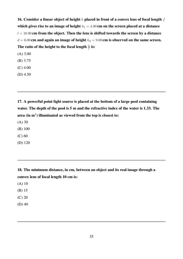 The minimum distance between the object and its real image is the sum of the object distance and image distance: \[ u + v = 2u = 40 \, cm. \] Quick Tip: For a real image through a convex lens, the minimum distance between the object and the image occurs when the object and image are equidistant from the lens.