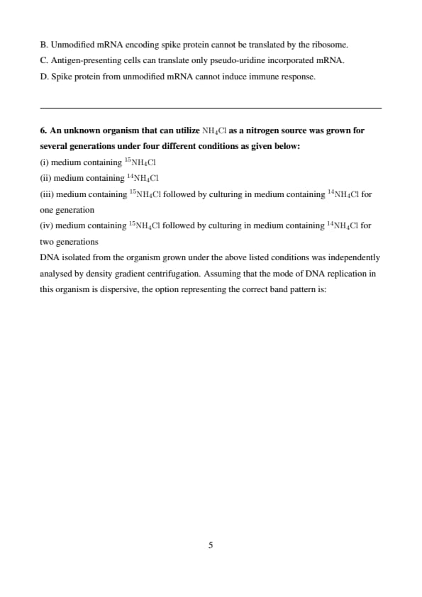This matches option (B). Quick Tip: In dispersive replication, each generation dilutes the heavier isotope content uniformly throughout both DNA strands. This causes the DNA to always appear as a single band of gradually decreasing density—not two bands.