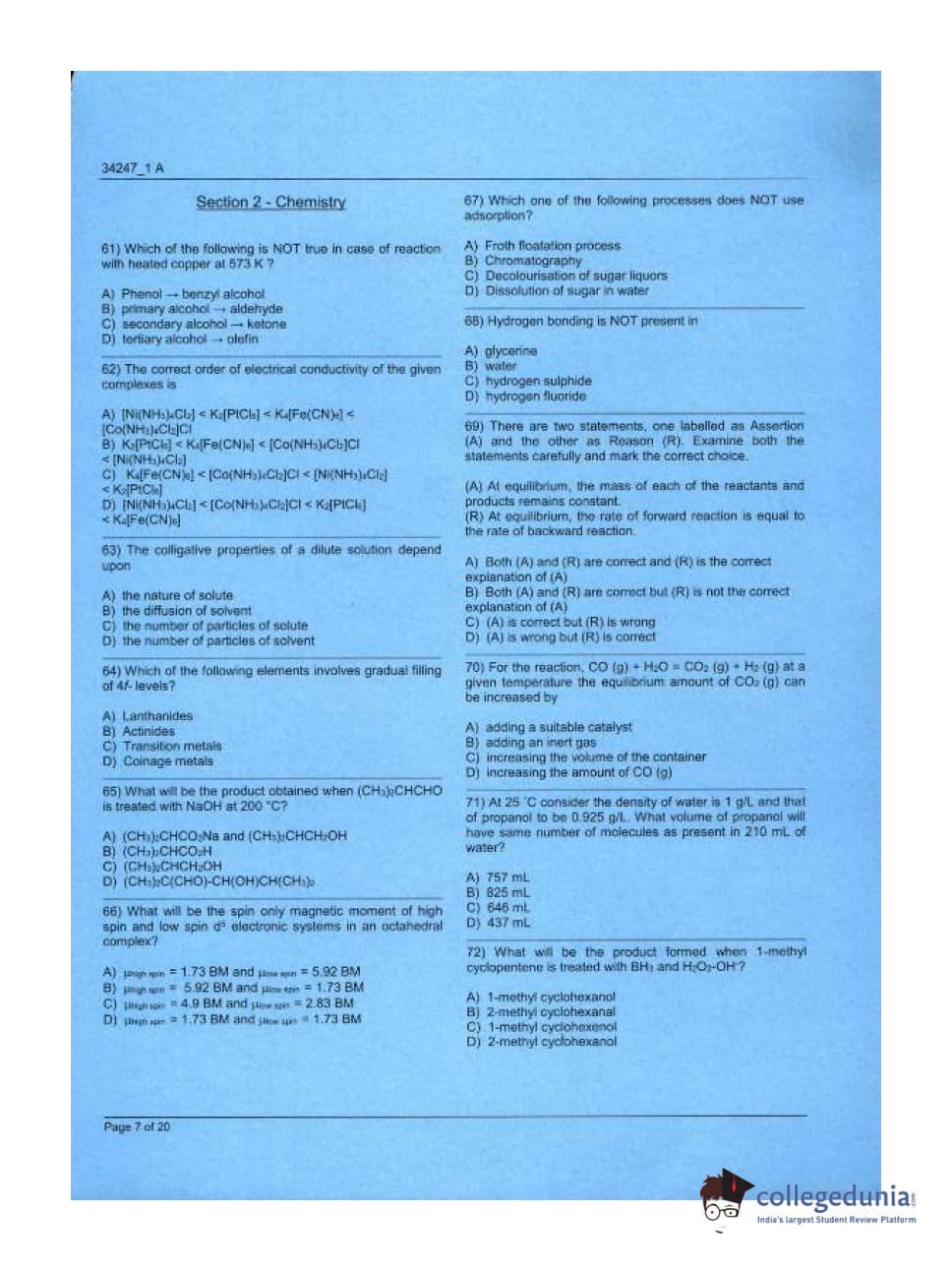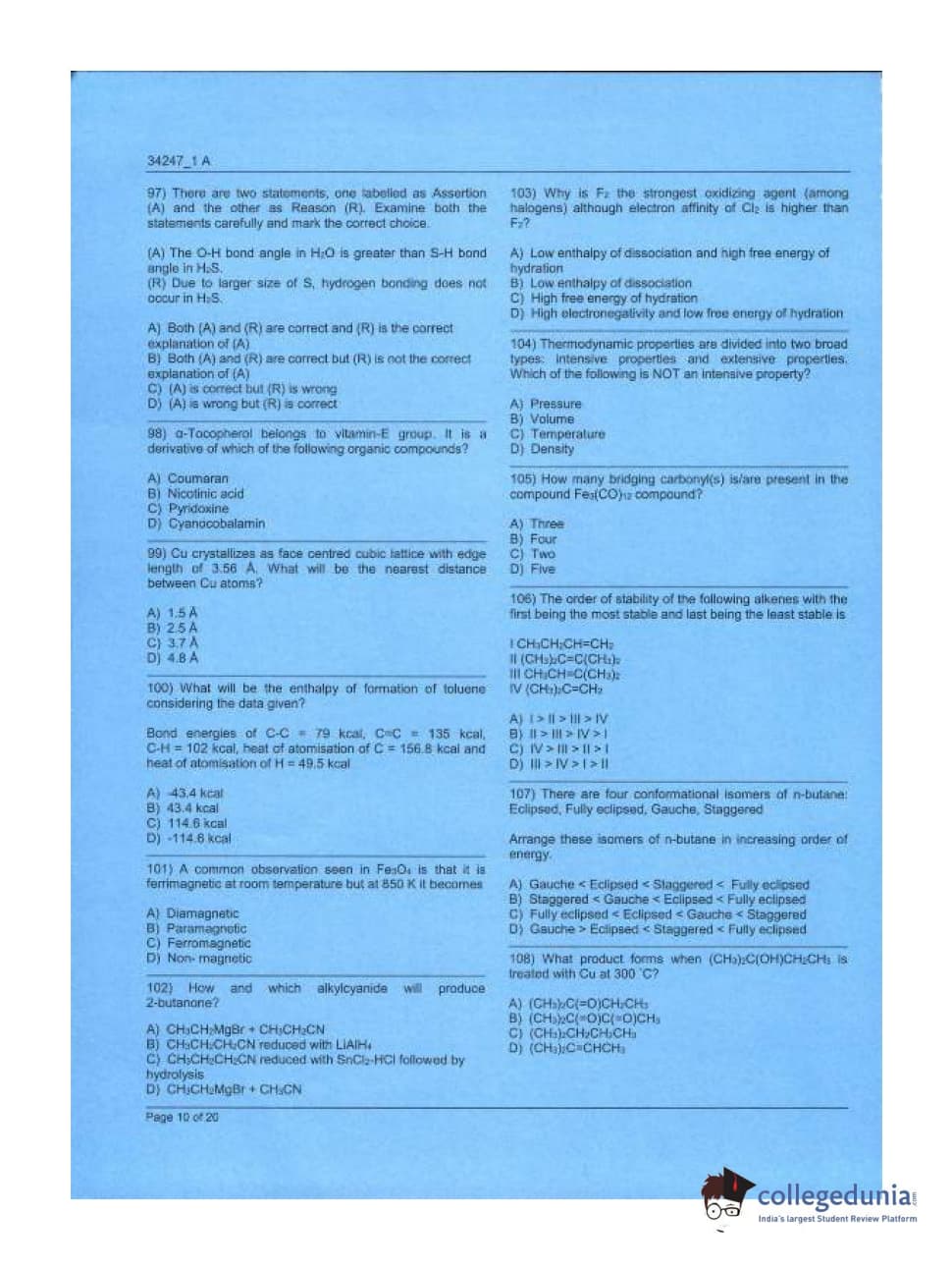 JKCET 2017 Chemistry Question paper with answer key pdf conducted on May 28, 2017 is available for download. The exam was successfully organized by JKBOPEE (Jammu & Kashmir Board of Professional Entrance Examinations). The question paper comprised a total of 60.0 questions.
