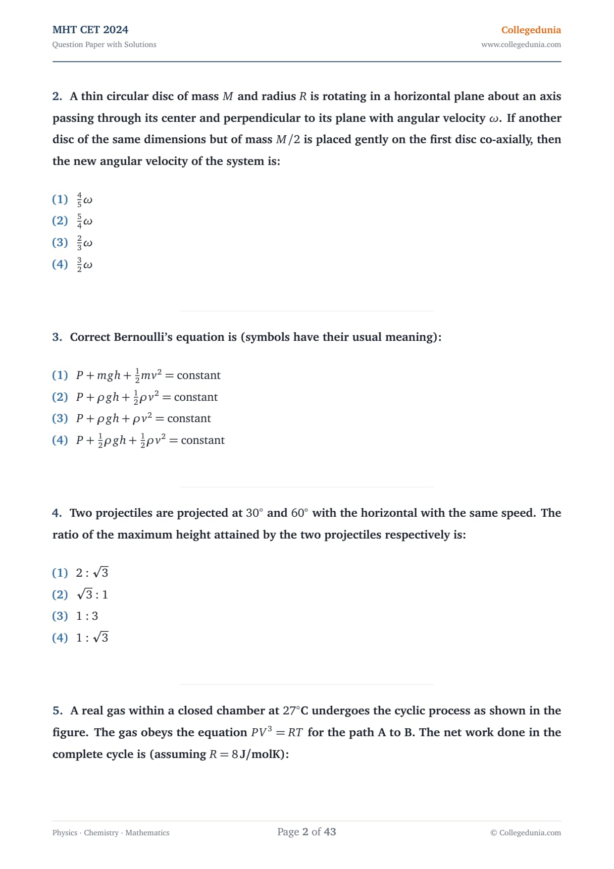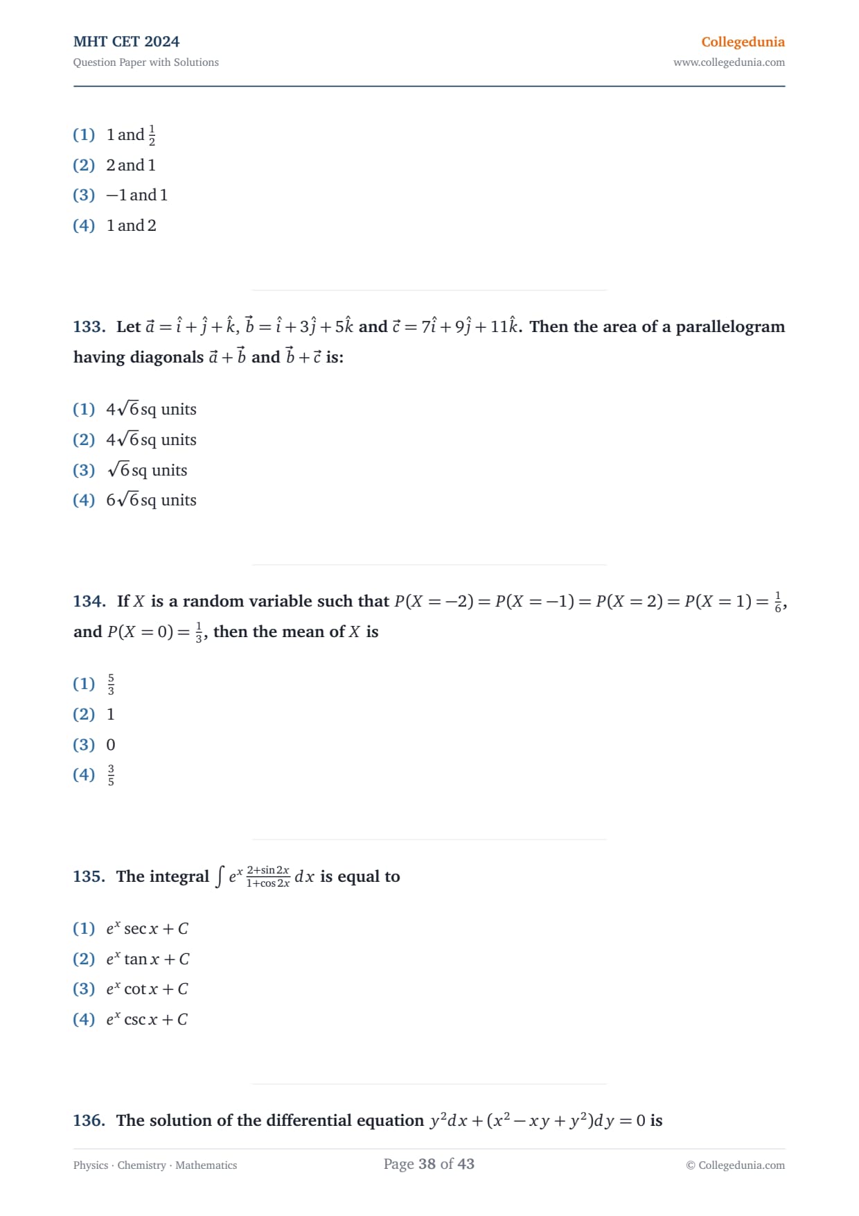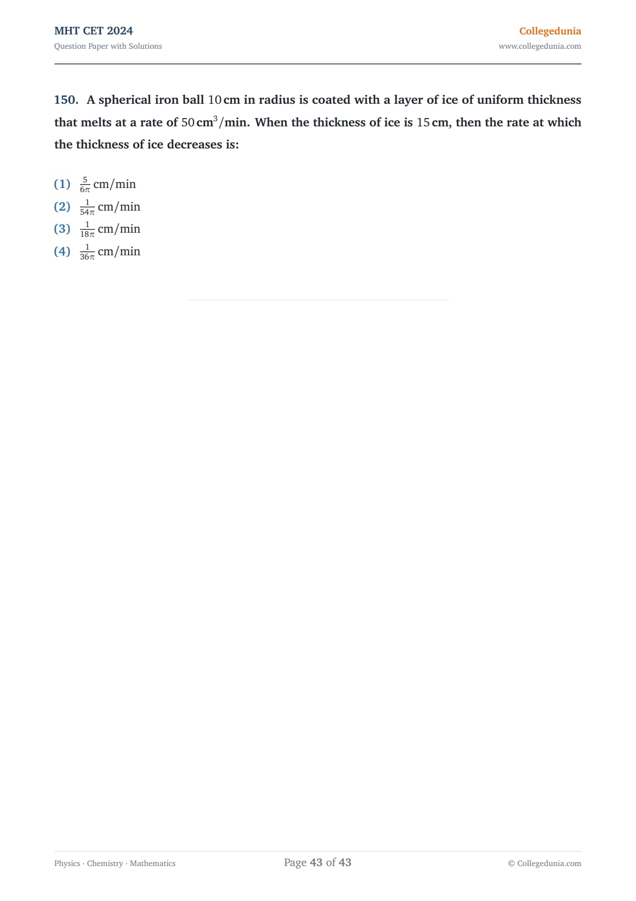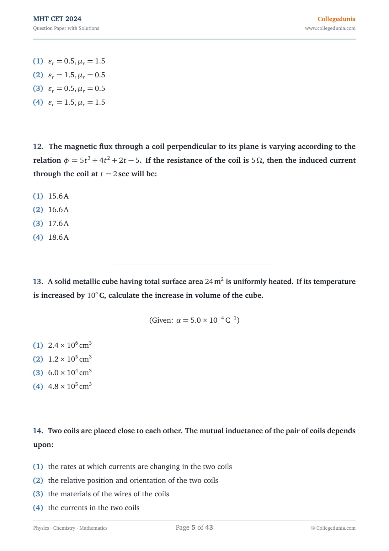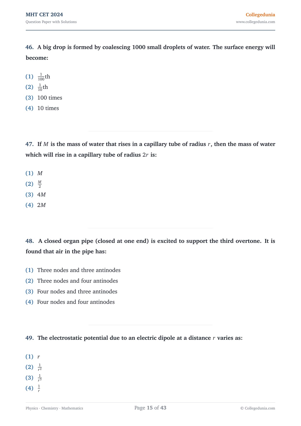 MHT CET 2024 Question Paper is available here with Solution PDF. MHT CET 2024 question paper comprises 150 MCQs carrying a total weightage of 200 marks. MHT CET 2024 Question Paper for PCM is divided into three subjects- Physics, Chemistry and Mathematics.