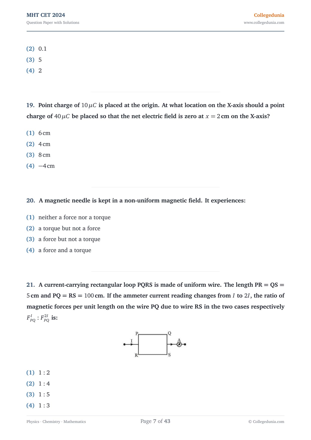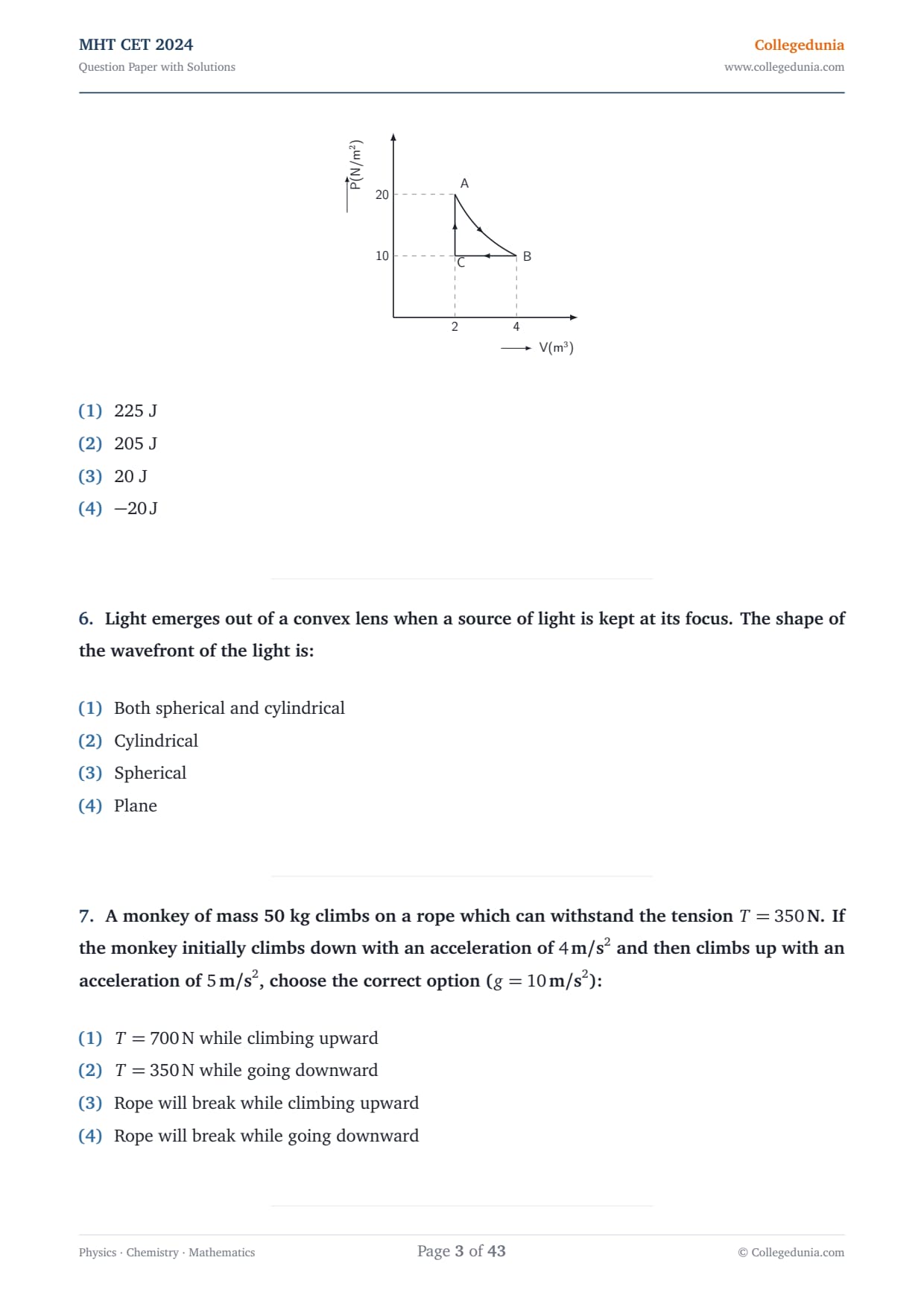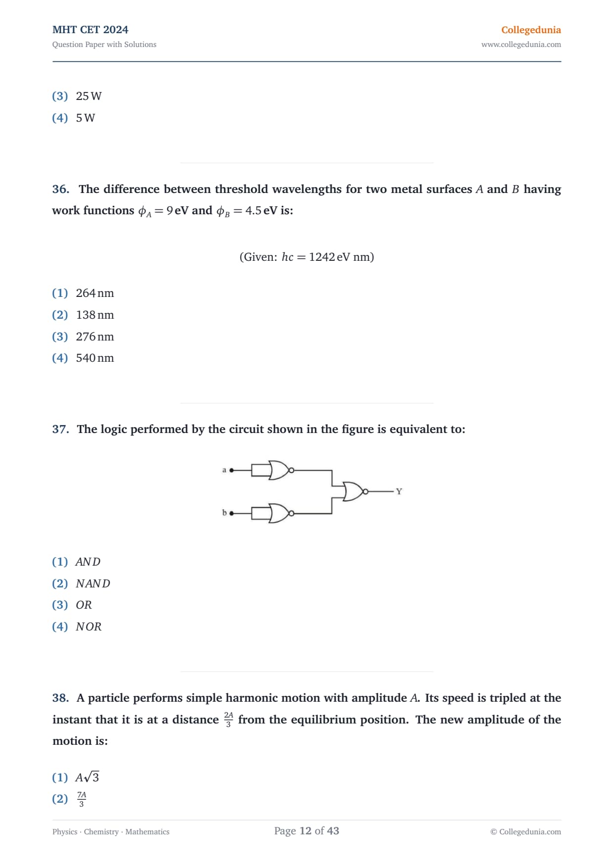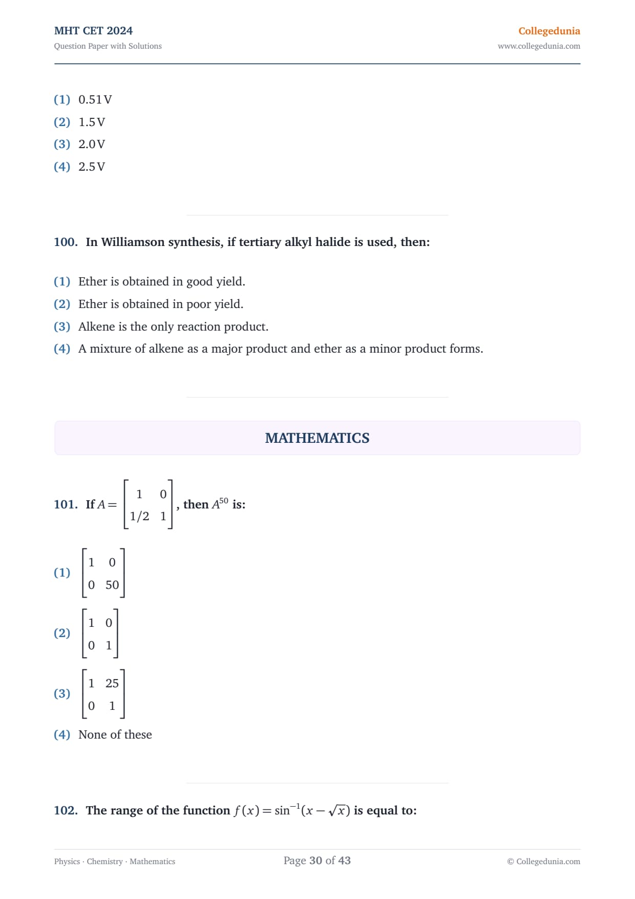 MHT CET 2024 Question Paper is available here with Solution PDF. MHT CET 2024 question paper comprises 150 MCQs carrying a total weightage of 200 marks. MHT CET 2024 Question Paper for PCM is divided into three subjects- Physics, Chemistry and Mathematics.