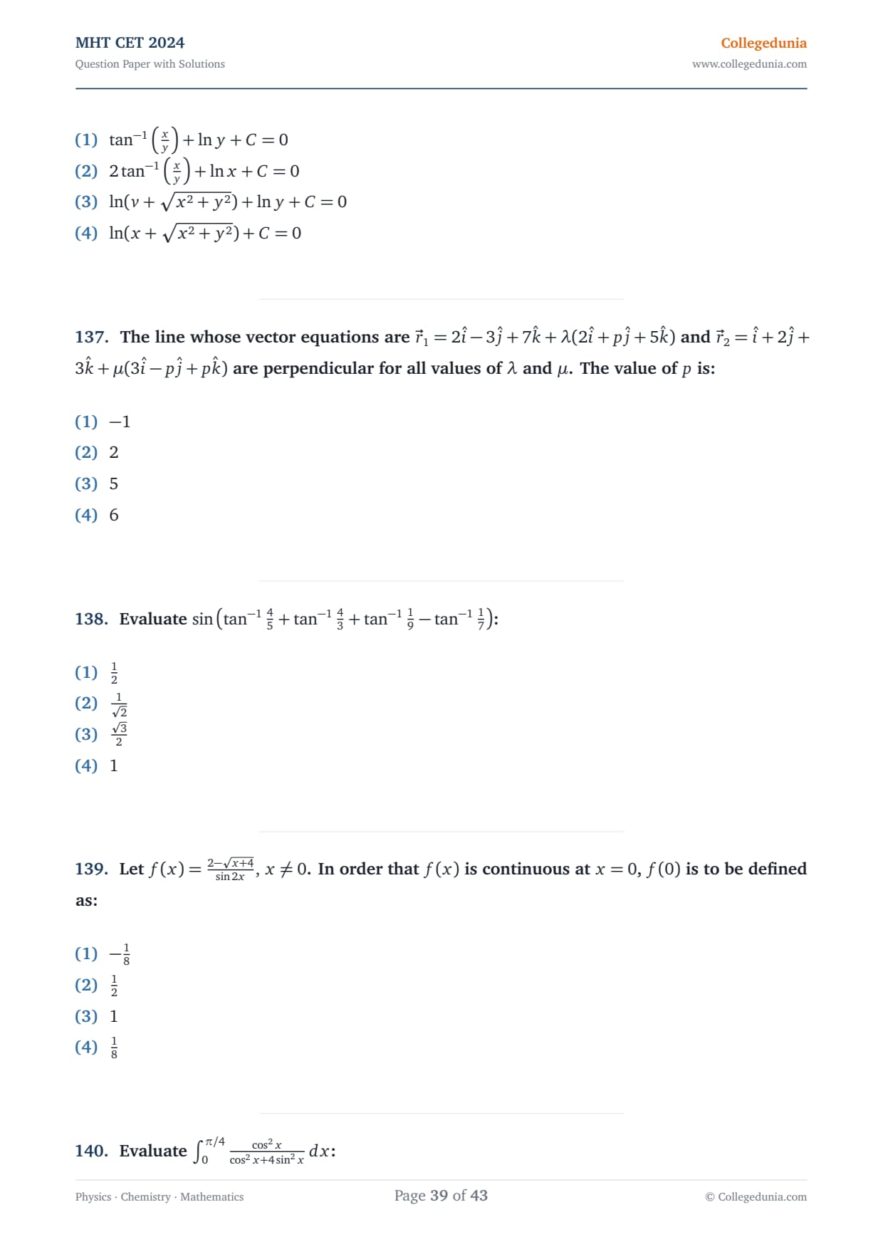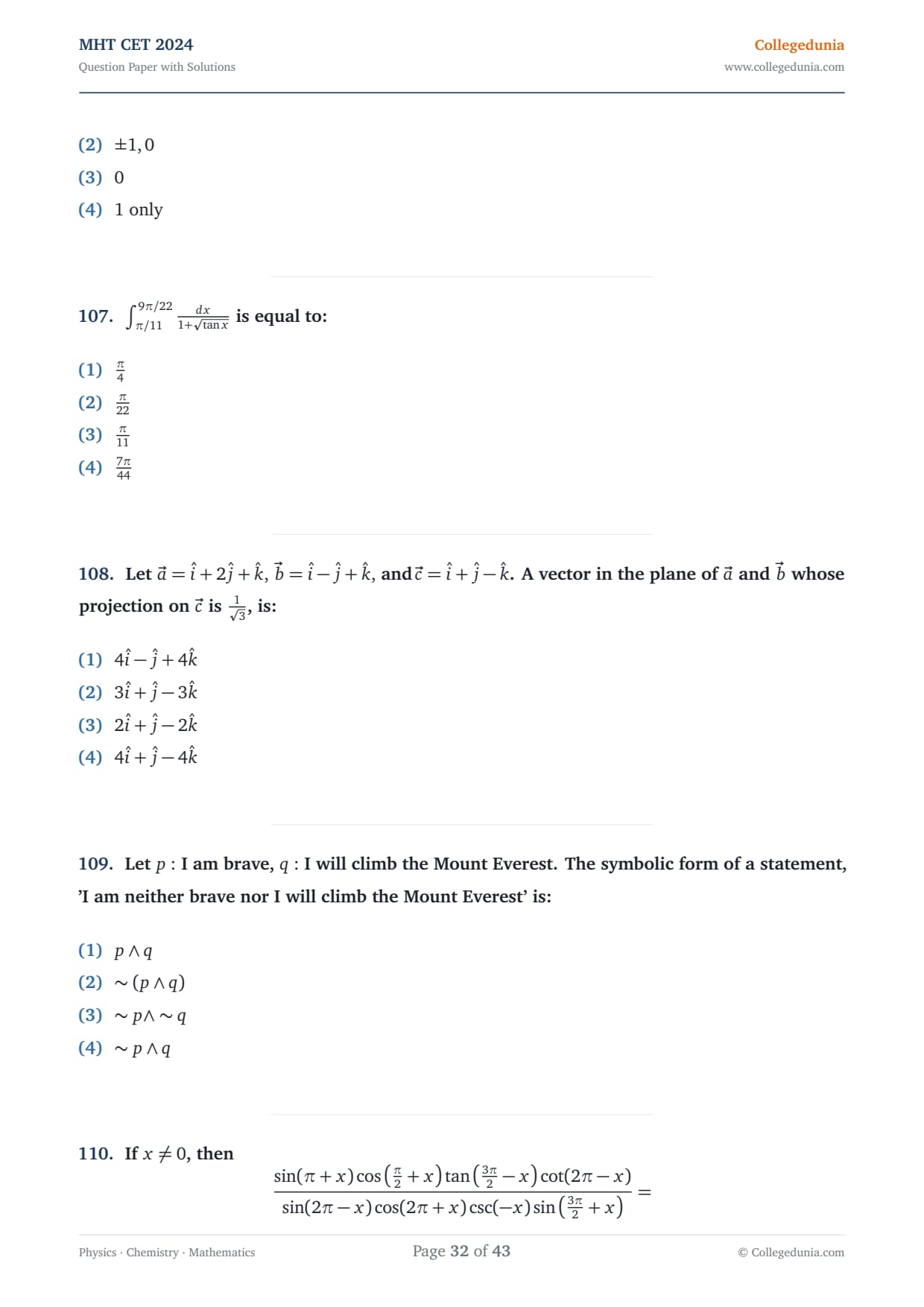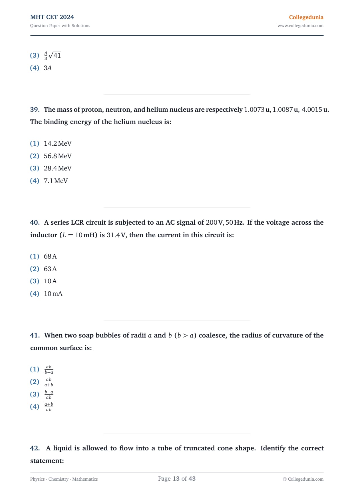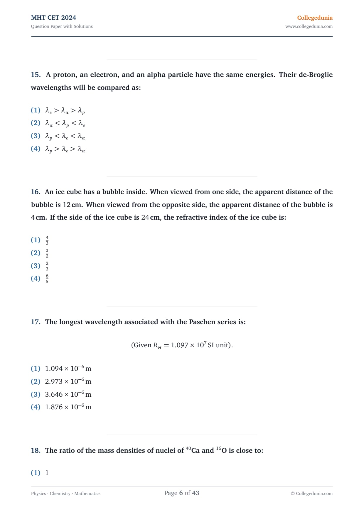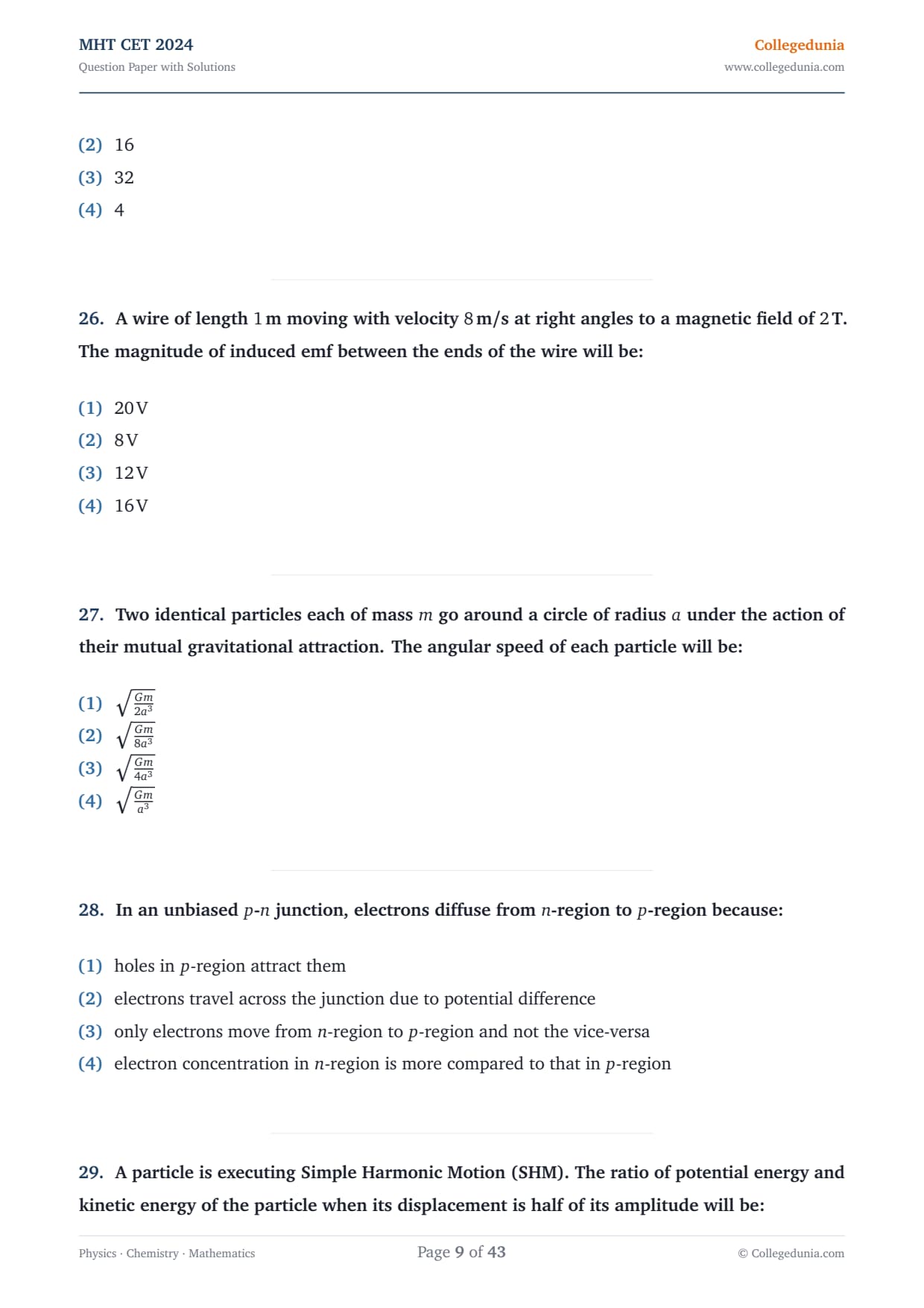 MHT CET 2024 Question Paper is available here with Solution PDF. MHT CET 2024 question paper comprises 150 MCQs carrying a total weightage of 200 marks. MHT CET 2024 Question Paper for PCM is divided into three subjects- Physics, Chemistry and Mathematics.
