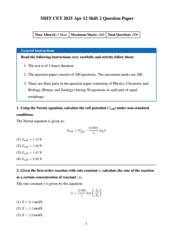 Also Check: MHT CET 2025 12 April Shift 1 Question Paper with Solutions