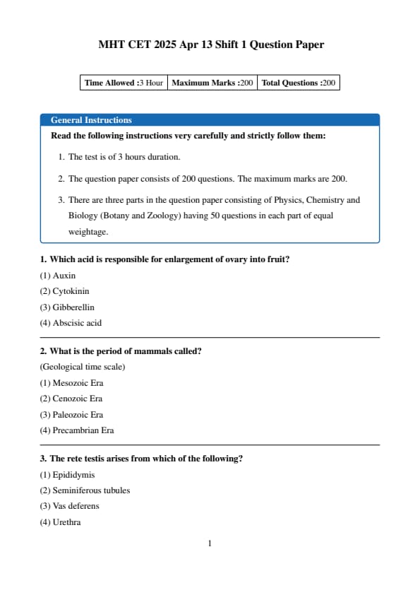 The MHT CET 2025 question paper for April 13 Shift 1 (PCB group) is available here with Solution PDF. The MHT CET 2025 question paper consists of 200 multiple-choice questions (MCQs) totaling 200 marks divided in 4 sections, Physics, Chemistry, Biology (Zoology, Botany) and 50 questions in each subject