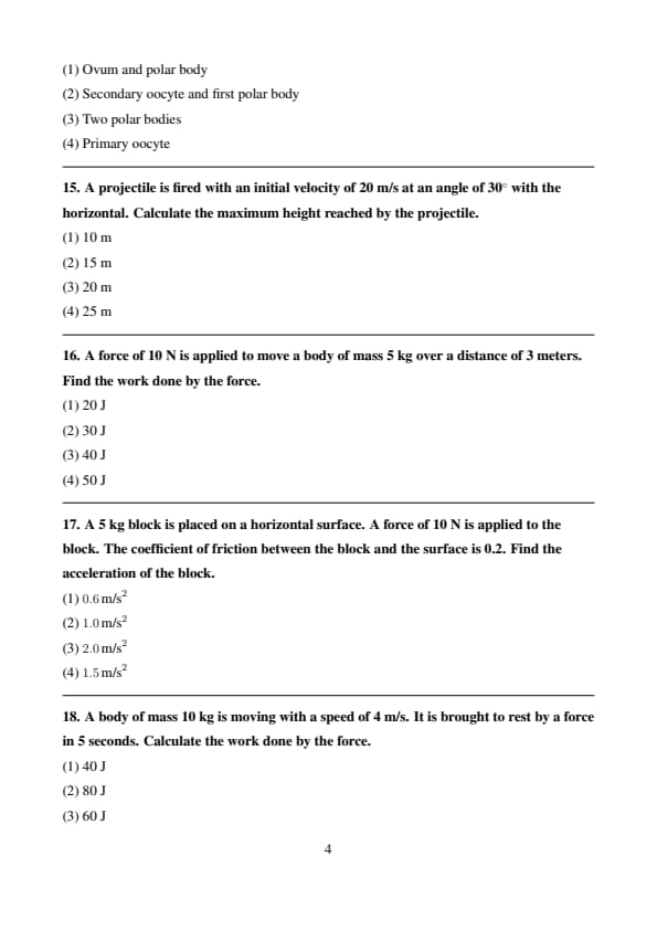 A body of mass 10 kg is moving with a speed of 4 m/s. It is brought to rest by a force in 5 seconds. Calculate the work done by the force.