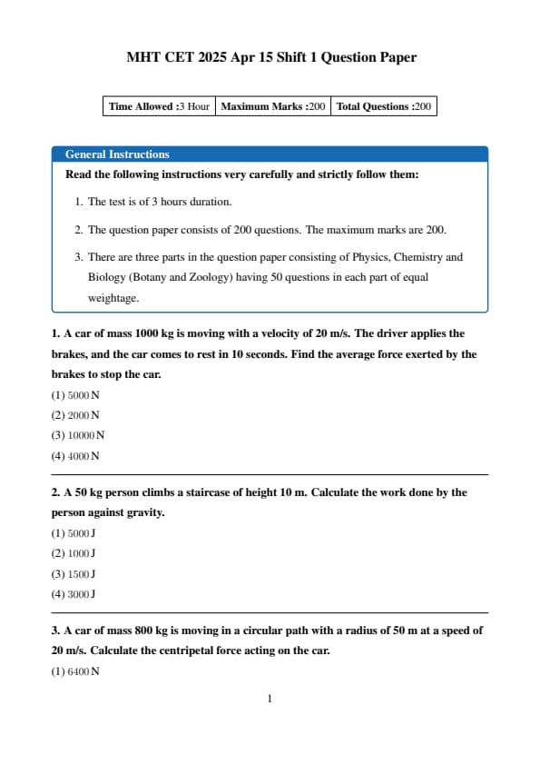 The MHT CET 2025 question paper for April 15 Shift 1 (PCB group) is available here with Solution PDF. The MHT CET 2025 question paper consists of 200 multiple-choice questions (MCQs) totaling 200 marks divided in 4 sections, Physics, Chemistry, Biology (Zoology, Botany) and 50 questions in each subject. MHT CET 2025 April 15 Shift 2 will be held from 2 PM to 5 PM