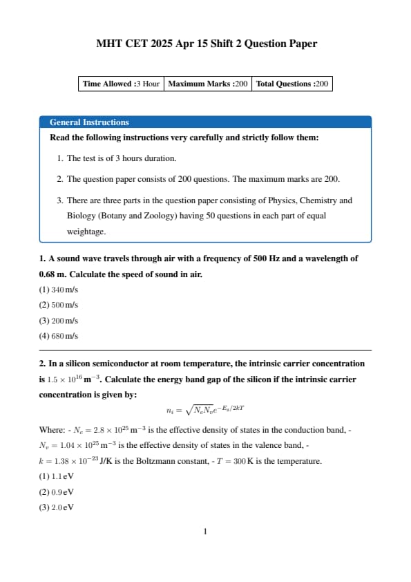 The MHT CET 2025 question paper for April 15 Shift 2 (PCB group) is available here with solutions PDF. The MHT CET 2025 question paper consists of 200 multiple-choice questions (MCQs) totaling 200 marks divided in 4 sections, Physics, Chemistry, Biology (Zoology, Botany) and 50 questions in each subject.