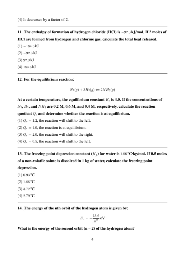 At a certain temperature, the equilibrium constant \( K_c \) is 4.0. If the concentrations of \( N_2 \), \( H_2 \), and \( NH_3 \) are 0.2 M, 0.6 M, and 0.4 M, respectively, calculate the reaction quotient \( Q_c \) and determine whether the reaction is at equilibrium.