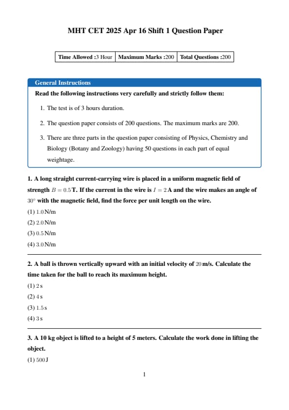 The MHT CET 2025 question paper for April 16 Shift 1 (PCB group) is available here with solution PDF. The MHT CET 2025 question paper consists of 200 multiple-choice questions (MCQs) totaling 200 marks divided in 4 sections, Physics, Chemistry, Biology (Zoology, Botany) and 50 questions in each subject.