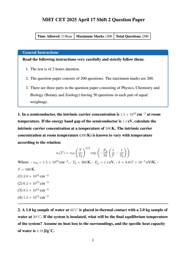 Also Check: MHT CET 2025 17 April Shift 1 Question Paper with Solutions