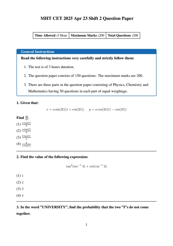 MHT CET 2025 23 April Shift 2 PCM Question Paper PDF Download
