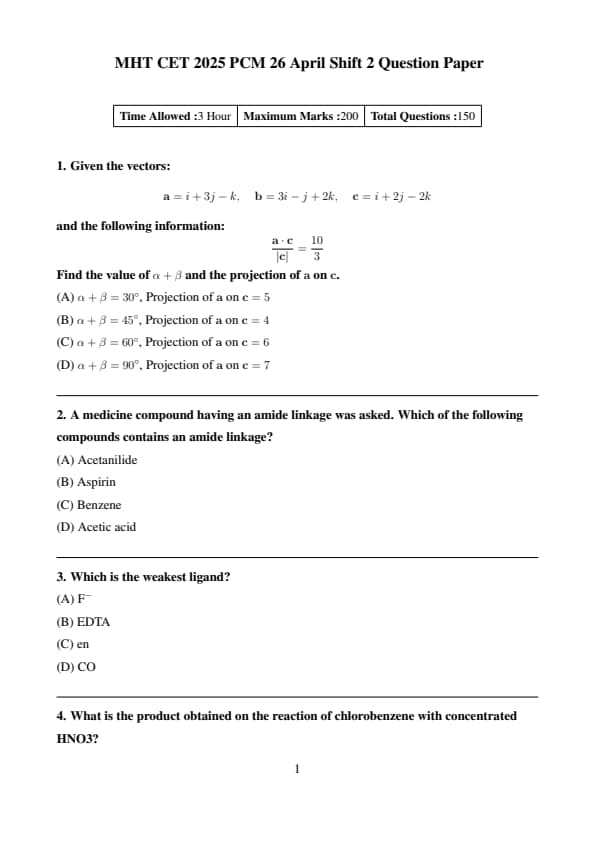 The MHT CET 2025 PCM Exam Shift 2 for 26th April 2025 was from 2:00 P.M. to 5:00 P.M. The MHT CET 2025 question paper for April 26 Shift 2 (PCM group) is available here with the solutions PDF.
