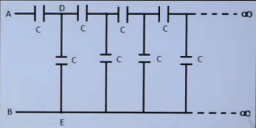The capacitance of an infinite circuit formed by the repetition of the same link consisting of two identical capacitors, each with capacitance \(C\), as shown in the figure is: