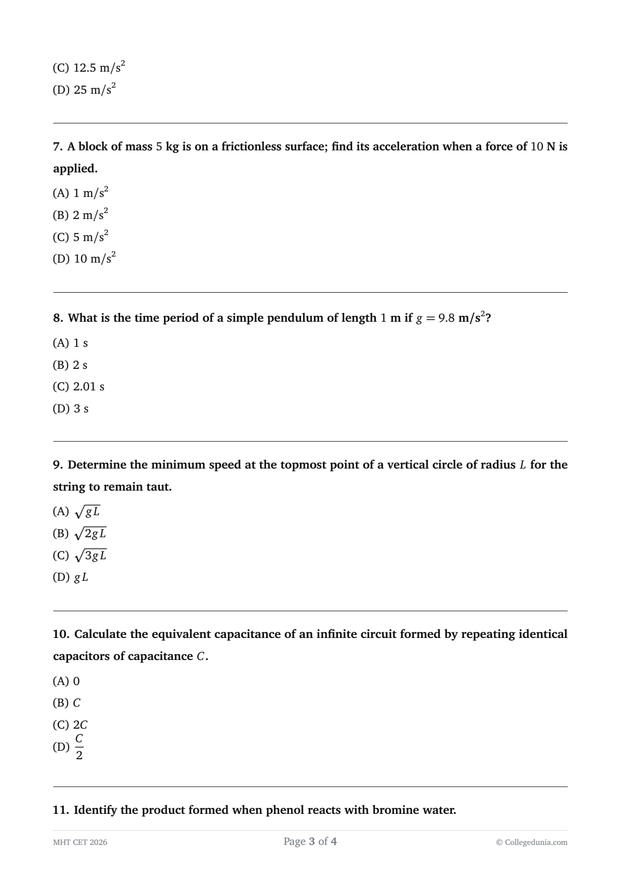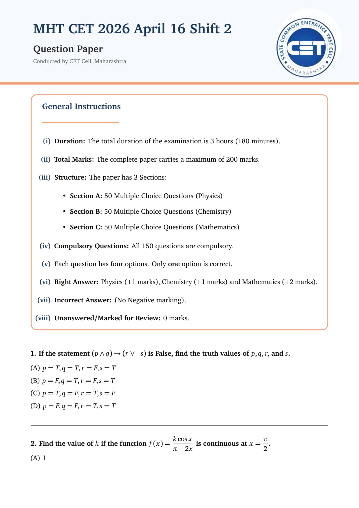 - The MHT CET 2026 PCM Question Paper consists of 150 multiple-choice questions (MCQs) totalling 200 marks divided into 3 sections: Physics, Chemistry, and Mathematics, with 50 questions in each subject.