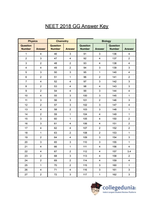 NEET 2018 Hindi GG Question Paper PDF NEET 2018 Hindi GG Answer Key PDF