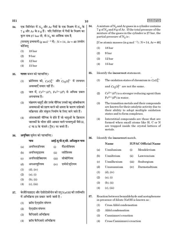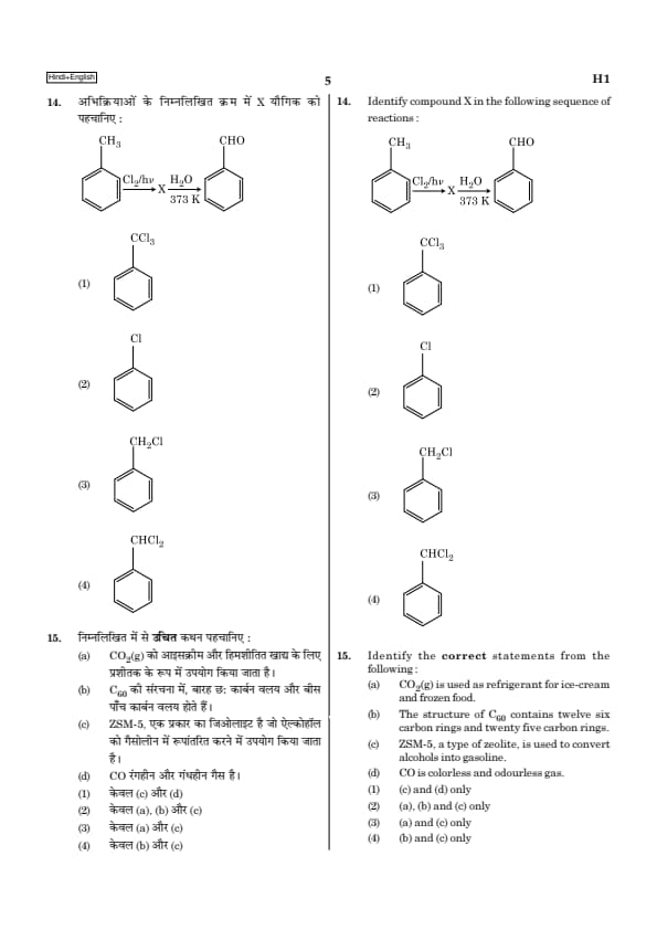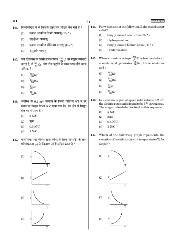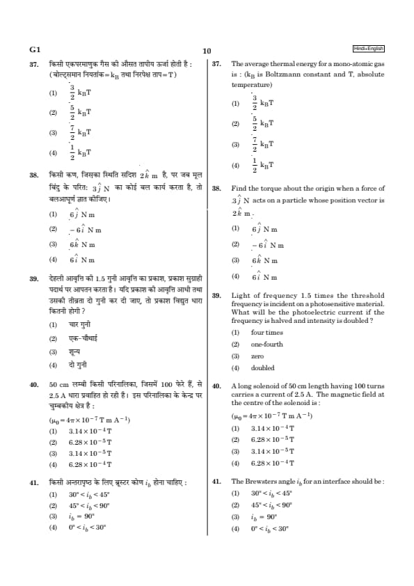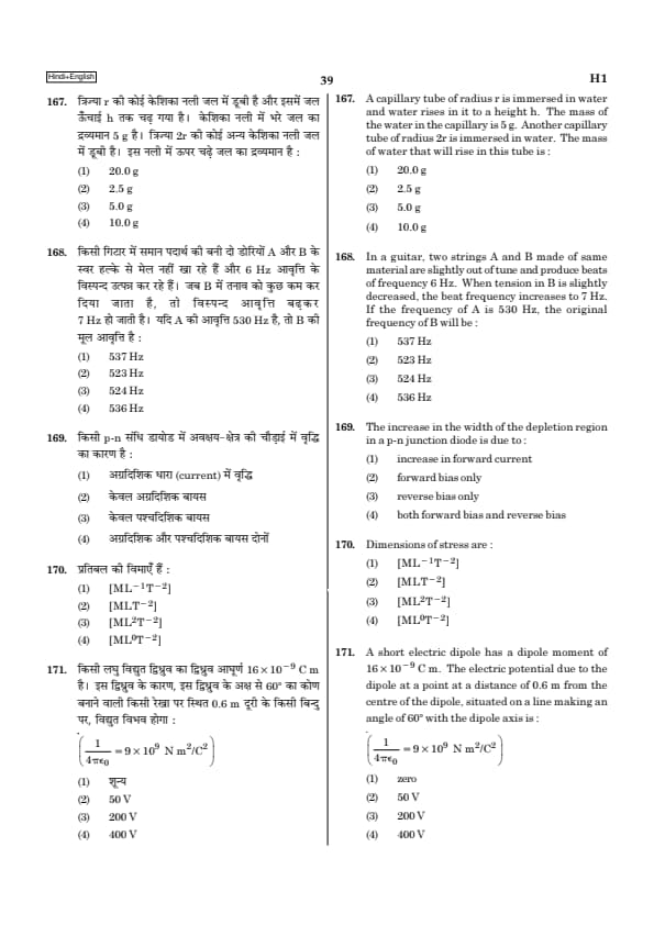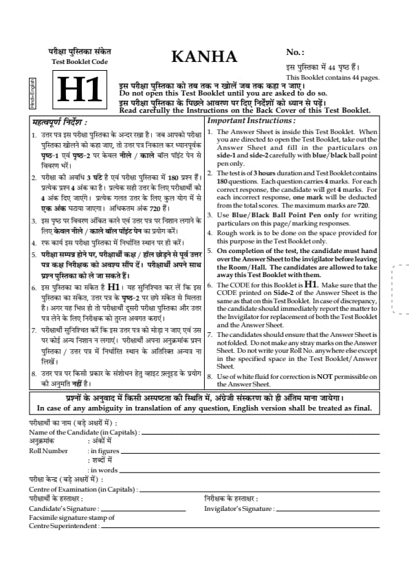 NEET 2020 Question Paper with Answer Key PDF in Hindi for E1 to H1 Paper Code