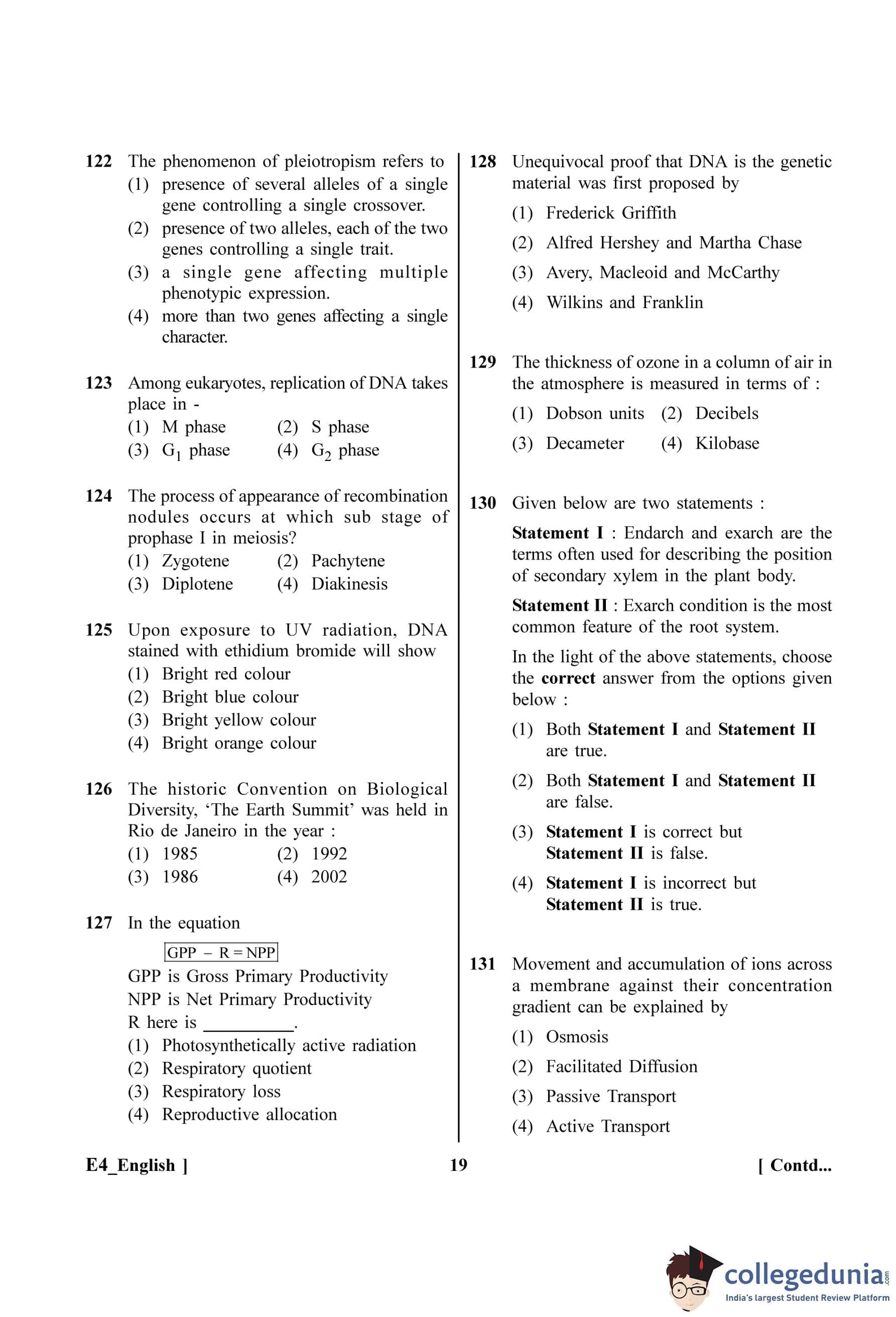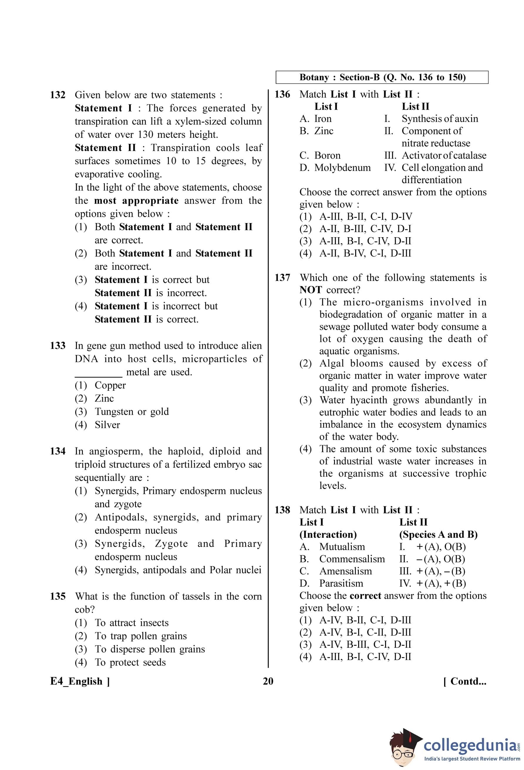 NEET 2023 Botany Question Paper with Solutions PDF E4 is available for download. NEET 2023 E4 Botany Question Paper comprises 50 MCQs out of which only 45 are to be attempted. NEET 2023 question E4 Botany is divided into 2 sections- A (35 questions) and B (15 questions).
