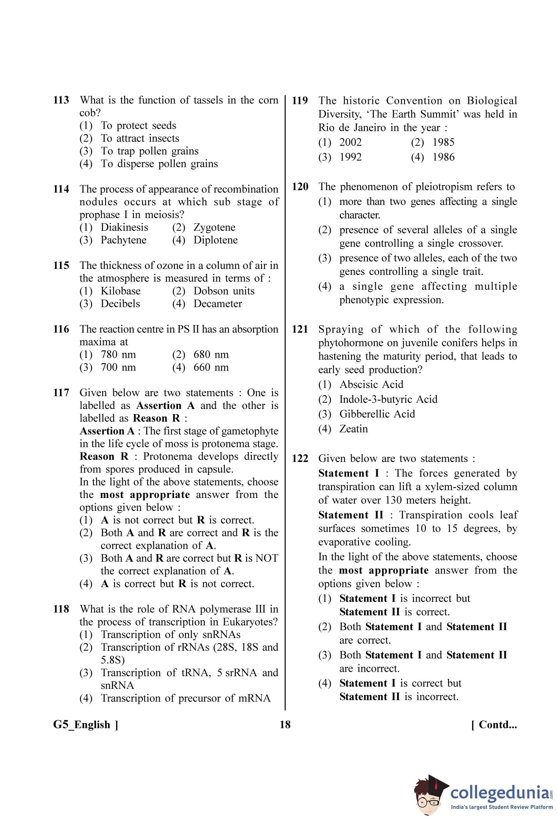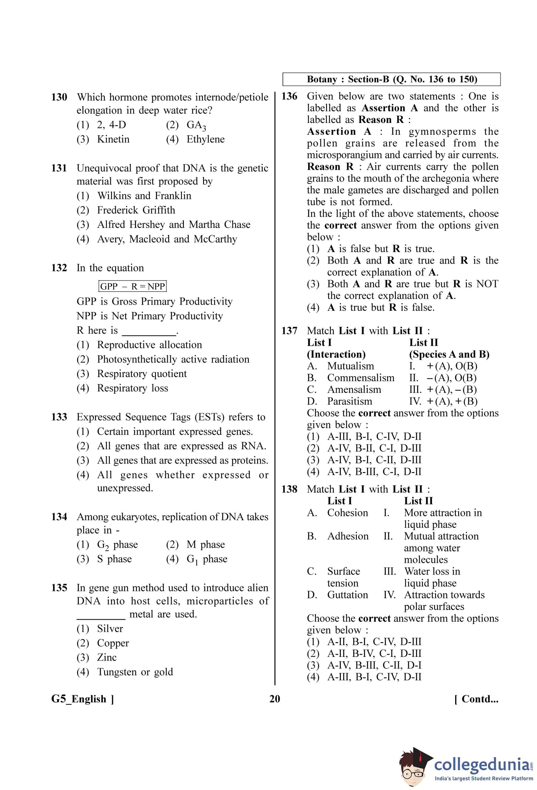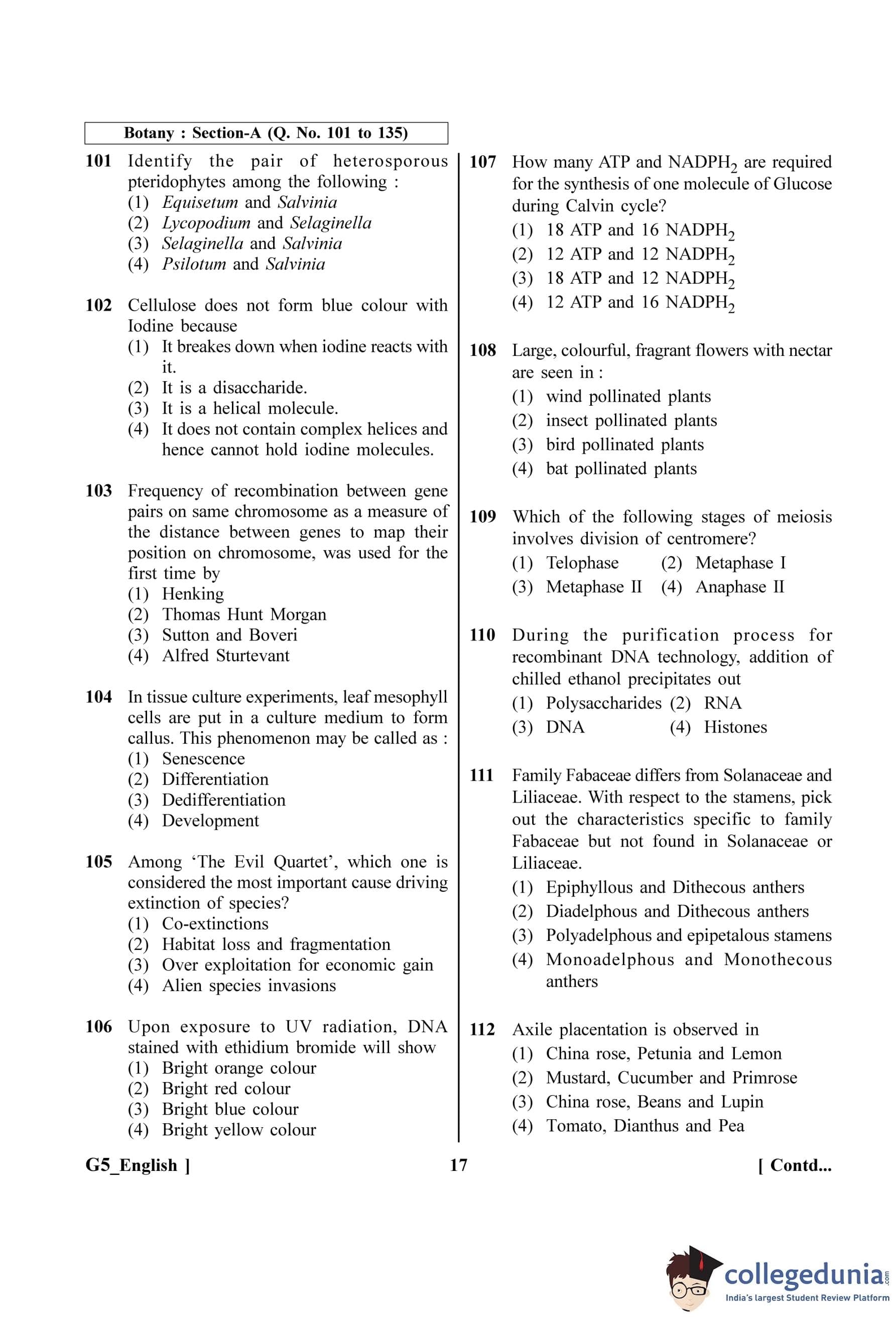 NEET 2023 Botany Question Paper with Solutions PDF G5 is available for download. NEET 2023 G5 Botany Question Paper comprises 50 MCQs out of which only 45 are to be attempted. NEET 2023 question G5 Botany is divided into 2 sections- A (35 questions) and B (15 questions).