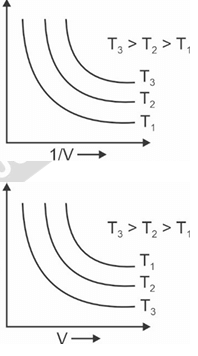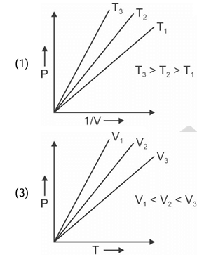 Graph (1): It plots P vs 1/V. It shows three straight lines passing through the origin for three different temperatures T\(_1\), T\(_2\), and T\(_3\). The slope of the line for T\(_3\) is the greatest, and the slope for T\(_1\) is the least. The condition given is T\(_3\) \(>\) T\(_2\) \(>\) T\(_1\). Since Slope \(\propto\) T, this graph correctly depicts Boyle's Law.