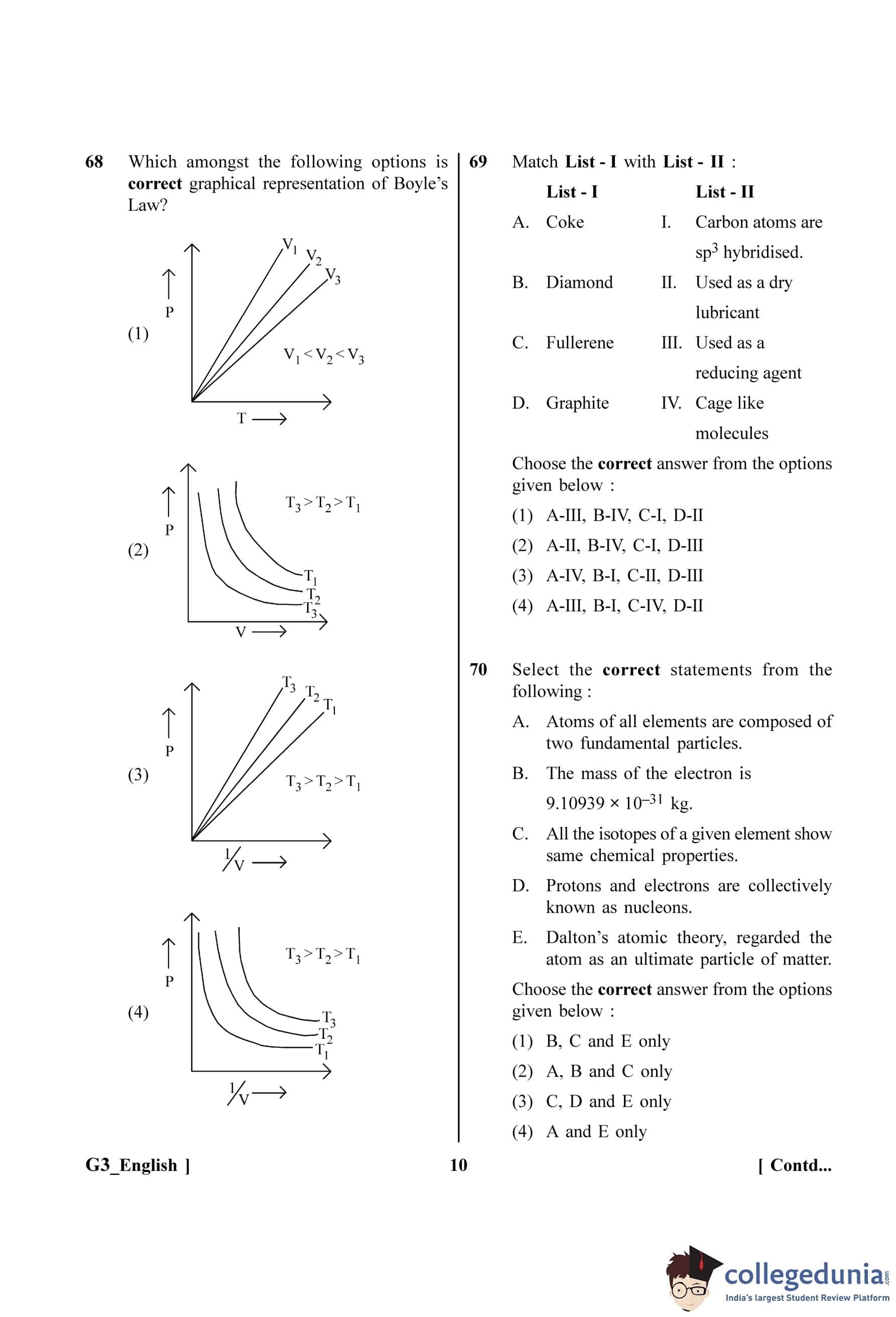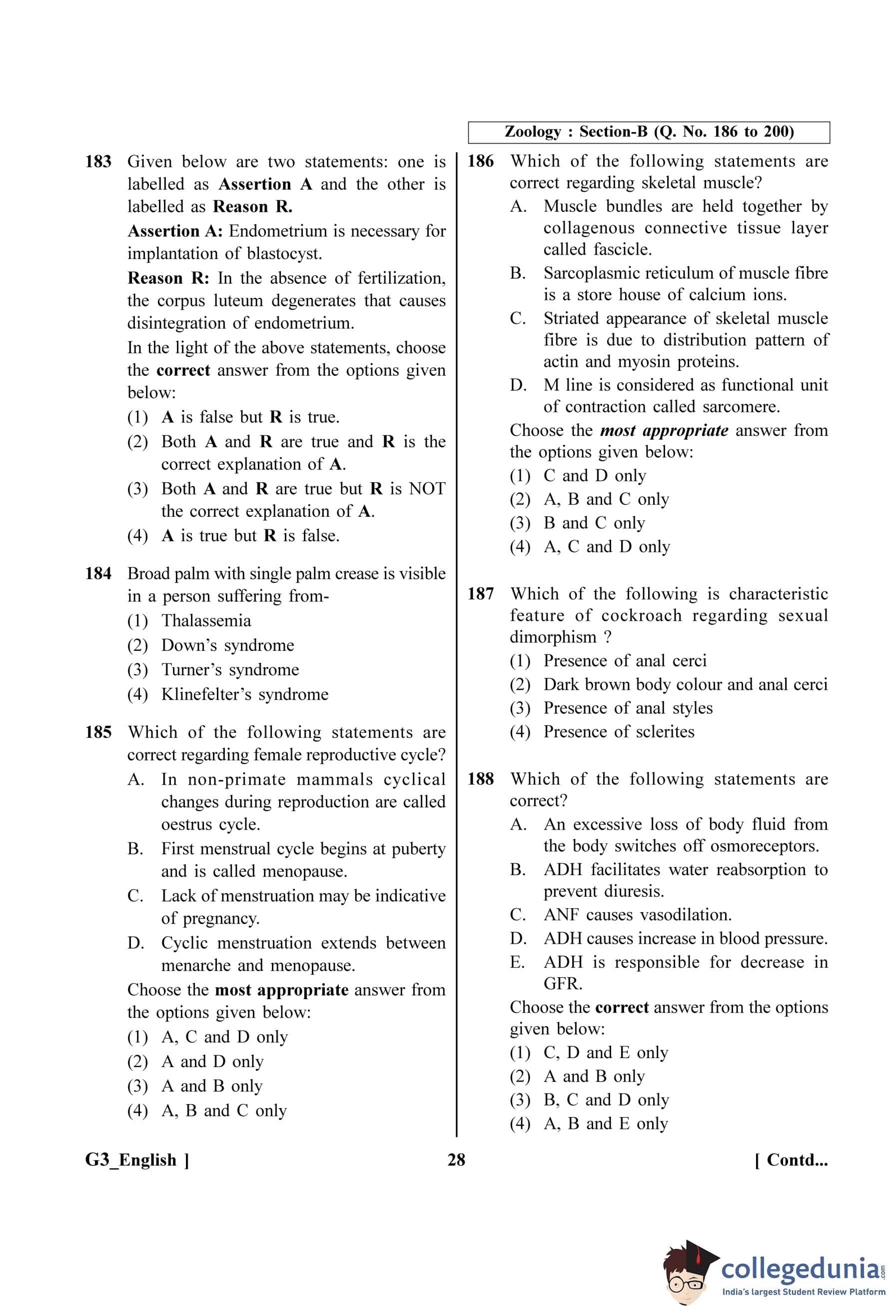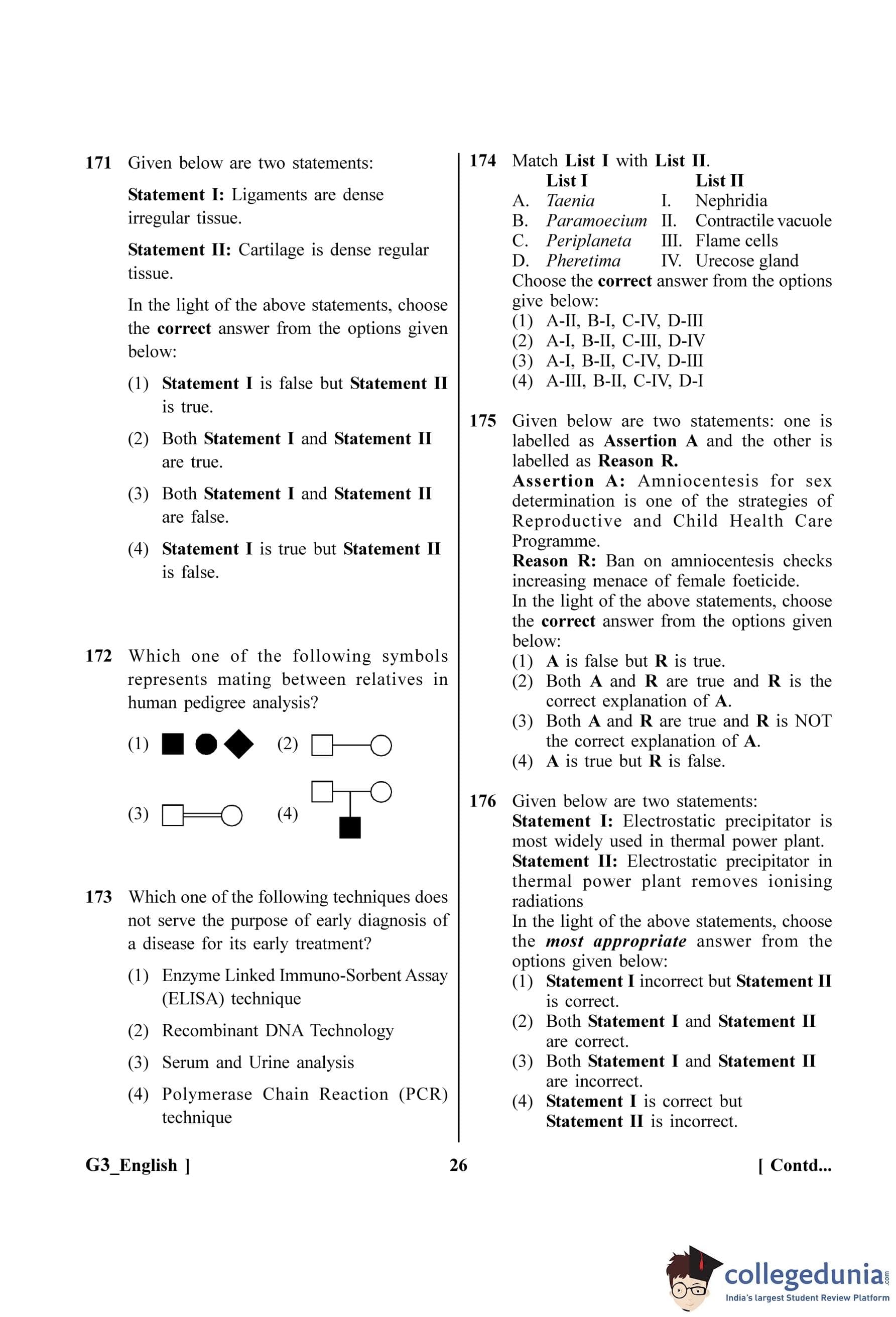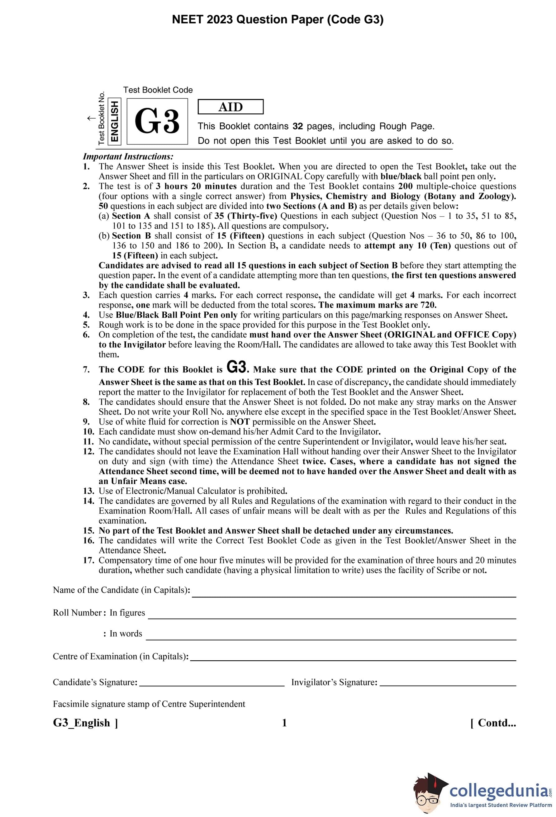 NEET 2023 Question paper with answer key pdf G3 is available for download. NEET 2023 G3 question paper has been conducted by the NTA on May 7, 2023, in pen-paper mode. NEET 2023 question paper code G3 consists of 200 MCQs- 180 to be attempted in 200 minutes. Each of the 4 subjects (Zoology, Botany, Chemistry, Physics) in NEET G3 question paper 2023 have 50 MCQs (45 to be attempted).
