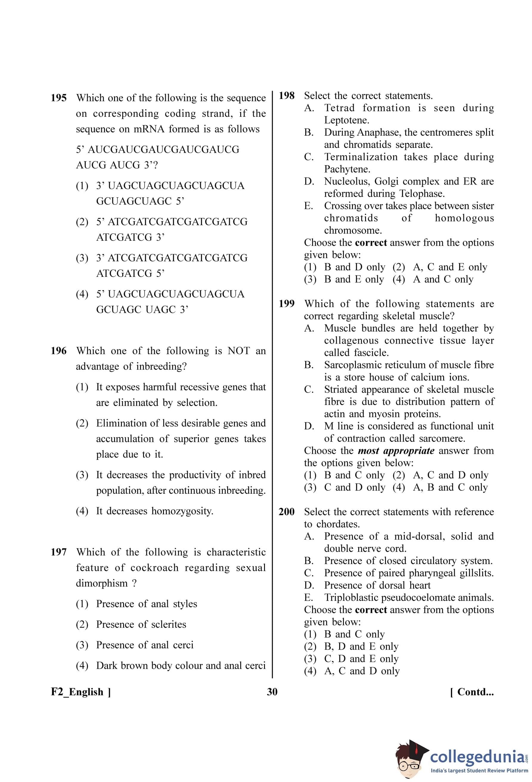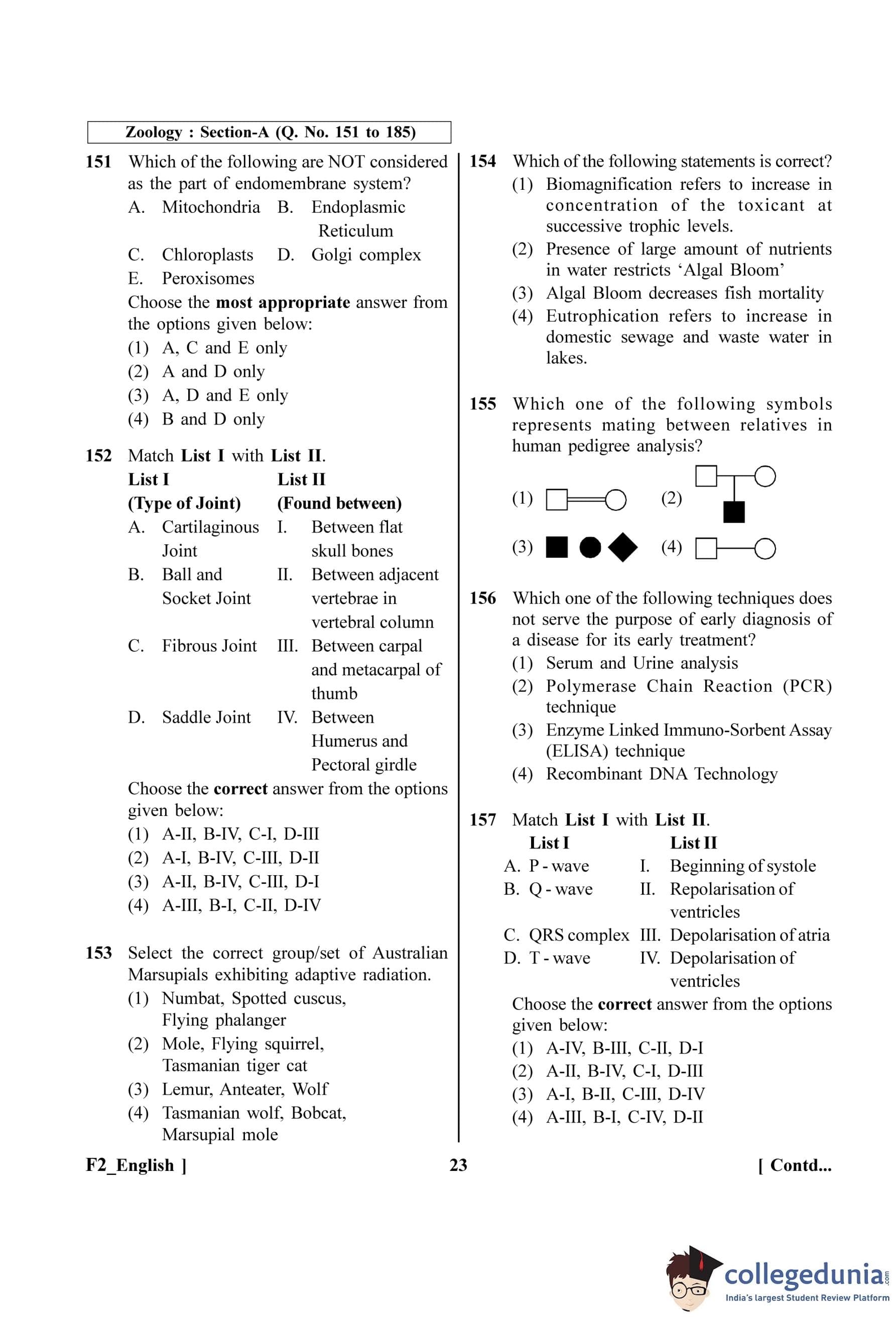 NEET 2023 Zoology Question Paper with Solutions PDF F2 is available for download. NEET 2023 F2 Zoology Question Paper comprises 50 MCQs out of which only 45 are to be attempted. NEET 2023 question F2 Zoology is divided into 2 sections- A (35 questions) and B (15 questions).