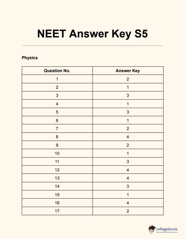 The official NEET 2024 answer key S5 by NTA will be released soon. Till then, you can calculate your scores using NEET 2024 answer key S5 with solutions PDF by experts given below. Check NEET Cutoff