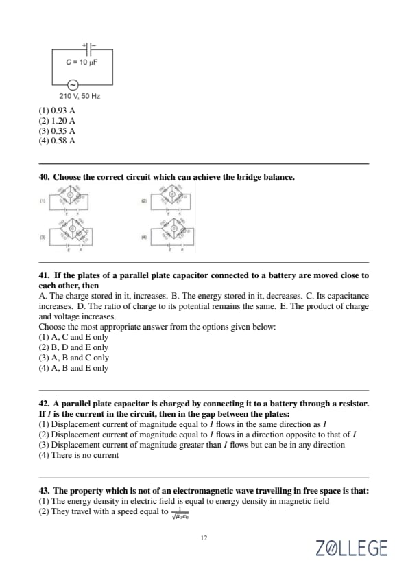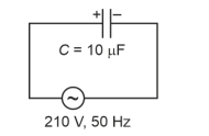 A \(10 \mu F\) capacitor is connected to a \(210 V\), \(50 Hz\) source as shown in figure. The peak current in the circuit is nearly (\(\pi = 3.14\)):