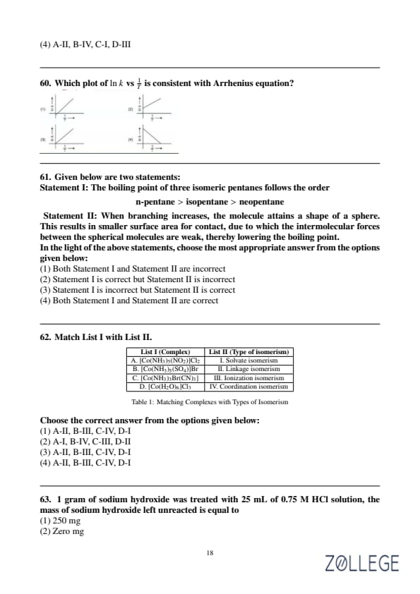 Given below are two statements: Statement I: The boiling point of three isomeric pentanes follows the order \[ \text{n-pentane} > \text{isopentane} > \text{neopentane} \] Statement II: When branching increases, the molecule attains a shape of a sphere. This results in smaller surface area for contact, due to which the intermolecular forces between the spherical molecules are weak, thereby lowering the boiling point. In the light of the above statements, choose the most appropriate answer from the options given below: