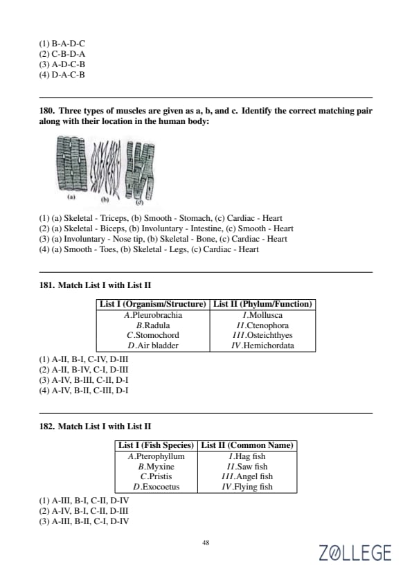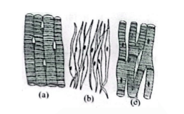 Three types of muscles are given as a, b, and c. Identify the correct matching pair along with their location in the human body: