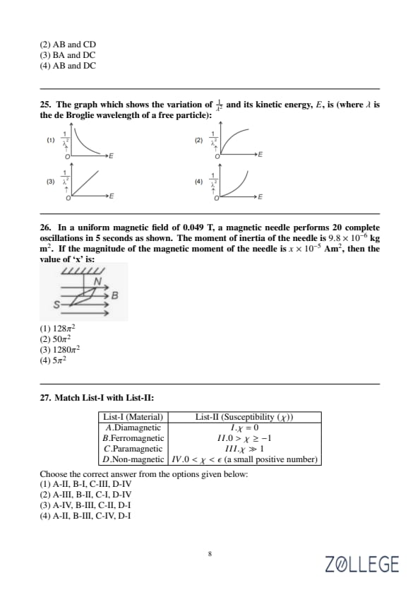The graph which shows the variation of \( \frac{1}{\lambda^2} \) and its kinetic energy, \( E \), is (where \( \lambda \) is the de Broglie wavelength of a free particle):