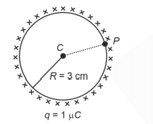 A thin spherical shell is charged by some source. The potential difference between the two points C and P (in V) shown in the figure is: (Take \( \frac{1}{4\pi\epsilon_0} = 9 \times 10^9 \) SI units)