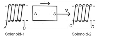 In the given diagram, a strong bar magnet is moving towards solenoid-2 from solenoid-1. The direction of induced current in solenoid-1 and that in solenoid-2, respectively, are through the directions: