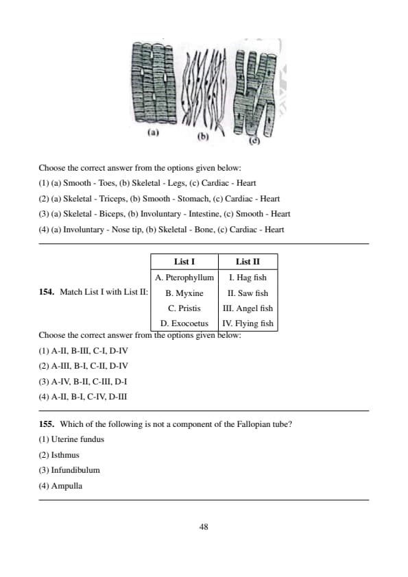 Three types of muscles are given as a, b, and c. Identify the correct matching pair along with their location in the human body: