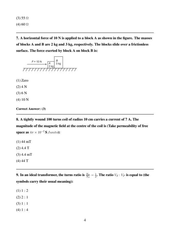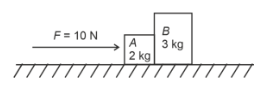 A horizontal force of 10 N is applied to a block A as shown in the figure. The masses of blocks A and B are 2 kg and 3 kg, respectively. The blocks slide over a frictionless surface. The force exerted by block A on block B is: