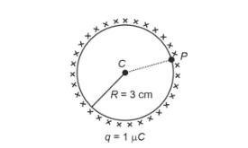 A thin spherical shell is charged by some source. The potential difference between the two points C and P (in V) shown in the figure is: