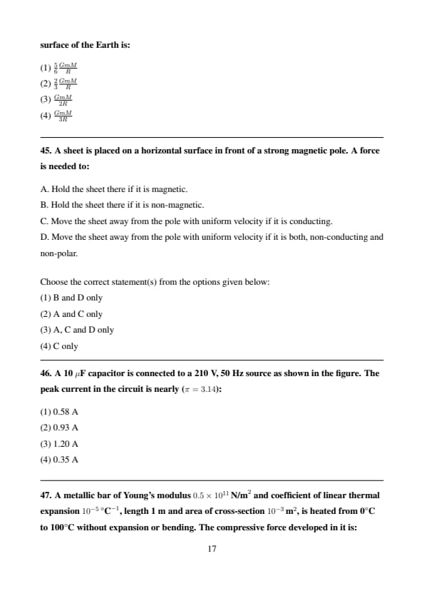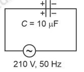 Magnetic sheets interact with magnetic fields, requiring a force to hold them in place. Conducting sheets moving in a magnetic field experience induced forces, which require an external force to move them at constant velocity.A 10 \(\mu\)F capacitor is connected to a 210 V, 50 Hz source as shown in the figure. The peak current in the circuit is nearly (\(\pi = 3.14\)):