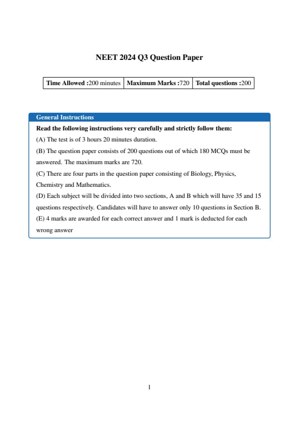 NEET 2024 Question paper with answer key pdf Q3 is available for download. NEET 2024 Q3 question paper has been conducted by the NTA on May 5, 2024, in pen-paper mode. NEET 2024 question paper code Q3 consists of 200 MCQs- 180 to be attempted in 200 minutes. Each of the 4 subjects (Zoology, Botany, Chemistry, Physics) in NEET Q3 question paper 2023 have 50 MCQs (45 to be attempted). You can download NEET 2024 question paper with answer key with solutions PDF for Q3 using the links given below. Check NEET CUTOFF