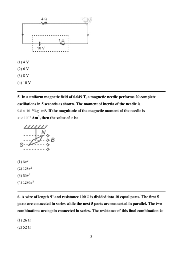In a uniform magnetic field of 0.049 T, a magnetic needle performs 20 complete oscillations in 5 seconds as shown. The moment of inertia of the needle is \( 9.8 \times 10^{-6} \, kg \cdot m^2 \). If the magnitude of the magnetic moment of the needle is \( x \times 10^{-5} \, Am^2 \), then the value of \( x \) is:
