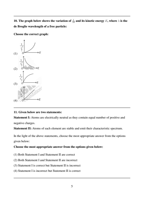 The graph below shows the variation of \( \frac{1}{\lambda{2}} \) and its kinetic energy \( E \), where \( \lambda \) is the de Broglie wavelength of a free particle: