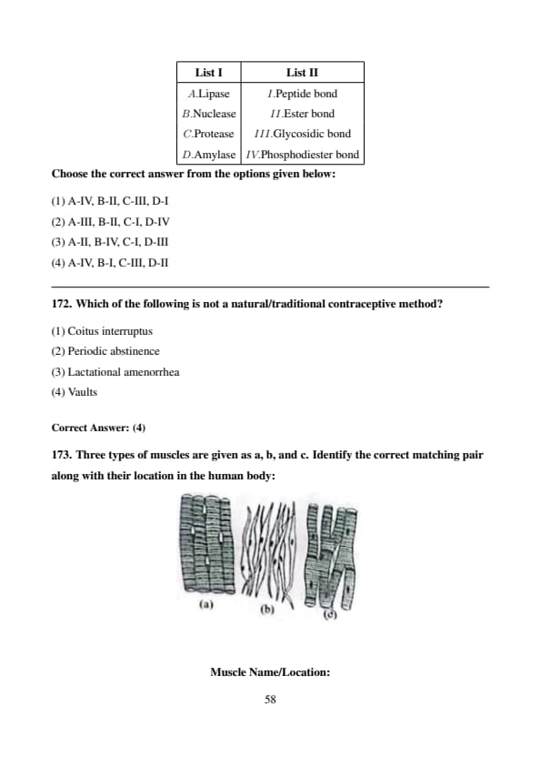 Three types of muscles are given as a, b, and c. Identify the correct matching pair along with their location in the human body: