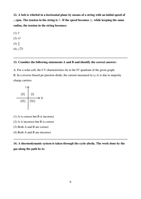 A bob is whirled in a horizontal plane by means of a string with an initial speed of \( \omega \, rpm \). The tension in the string is \( T \). If the speed becomes \( 2\omega \) while keeping the same radius, the tension in the string becomes: