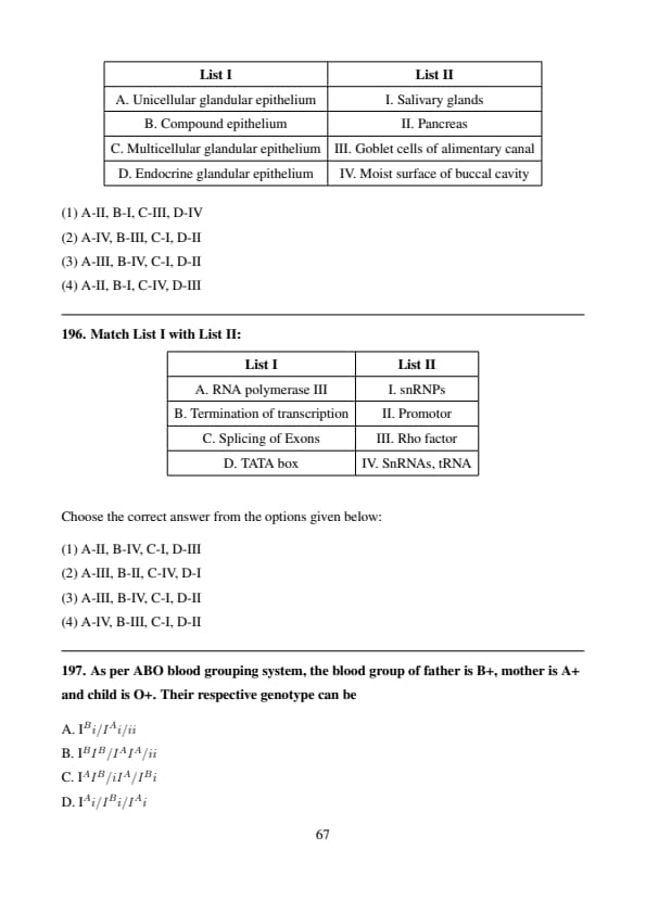 As per ABO blood grouping system, the blood group of father is \( B^+ \), mother is \( A^+ \), and the child is \( O^+ \). Their respective genotype can be: