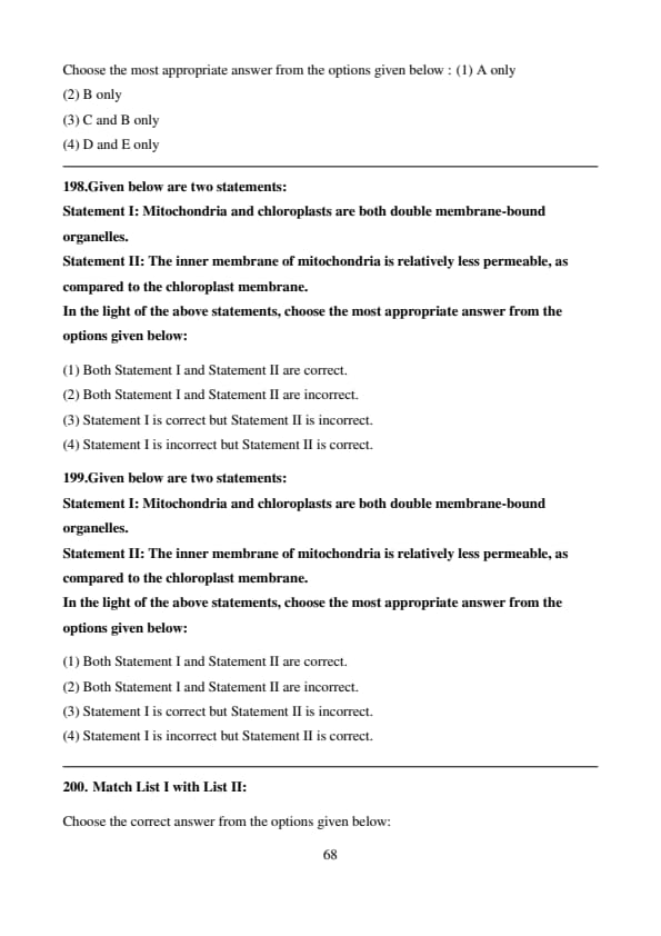 Statement II: The inner membrane of mitochondria is relatively less permeable compared to chloroplast.