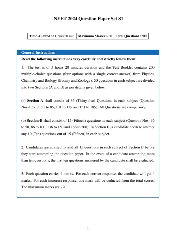 NEET 2024 Question paper with answer key pdf S1 is available for download. NEET 2024 S1 question paper has been conducted by the NTA on May 5, 2024, in pen-paper mode. NEET 2024 question paper code S1 consists of 200 MCQs- 180 to be attempted in 200 minutes. Each of the 4 subjects (Zoology, Botany, Chemistry, Physics) in NEET S1 question paper 2023 have 50 MCQs (45 to be attempted). You can download NEET 2024 question paper with answer key with solutions PDF for S1 using the links given below.