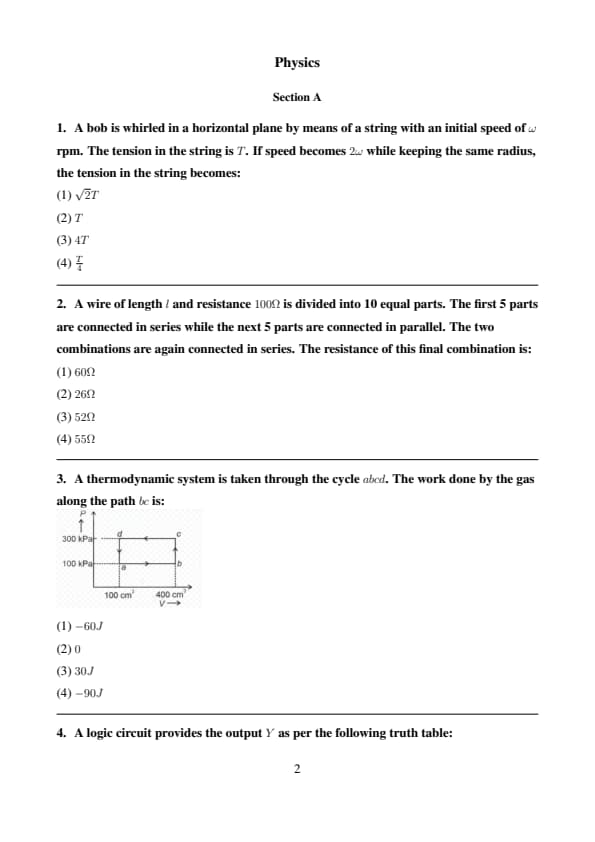 A bob is whirled in a horizontal plane by means of a string with an initial speed of \( \omega \) rpm. The tension in the string is \( T \). If speed becomes \( 2\omega \) while keeping the same radius, the tension in the string becomes: